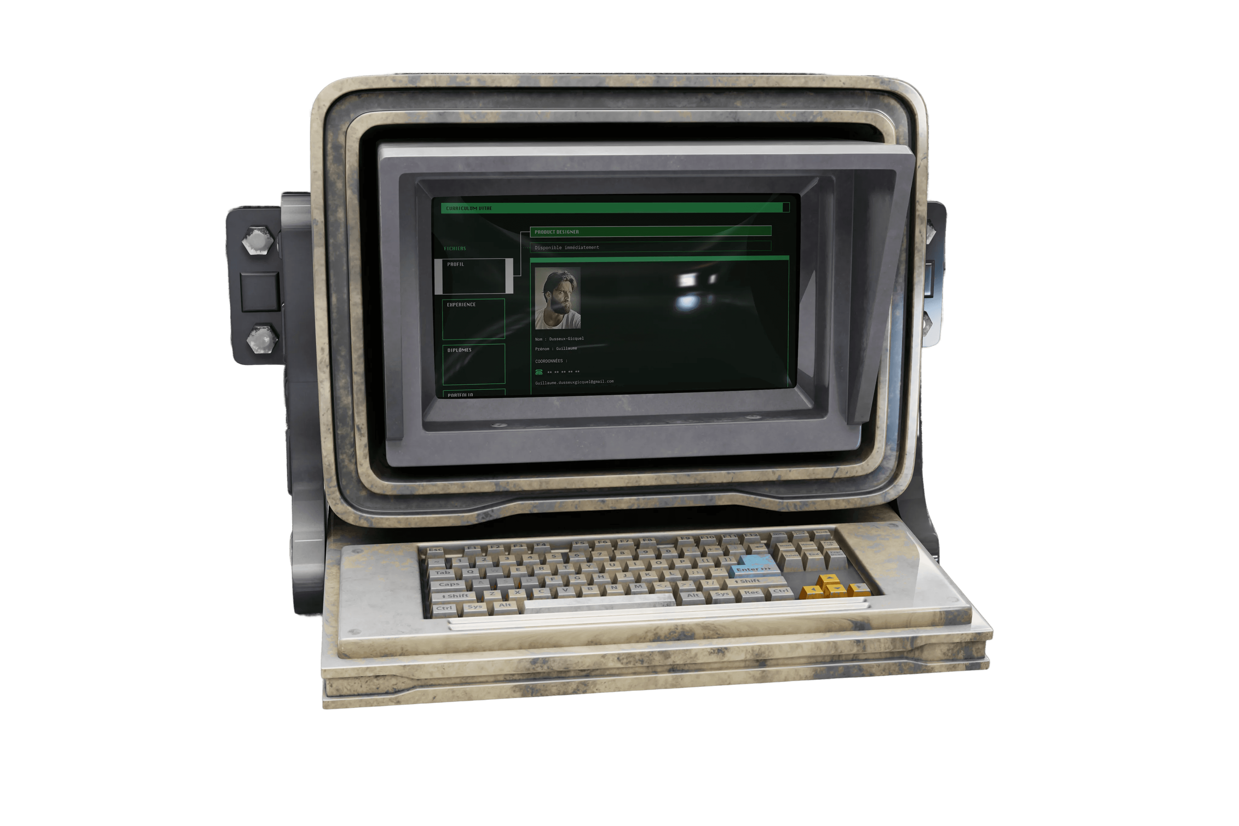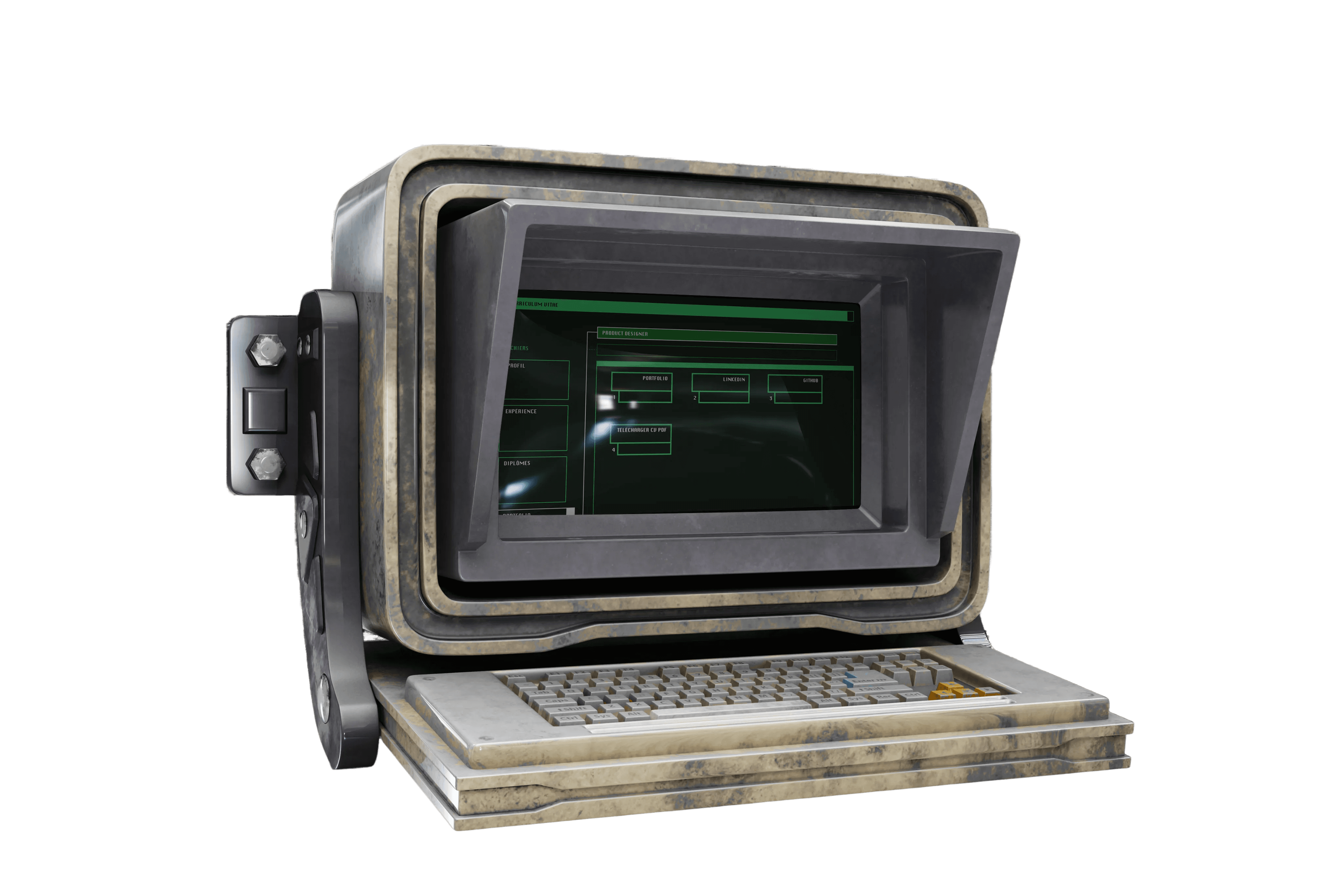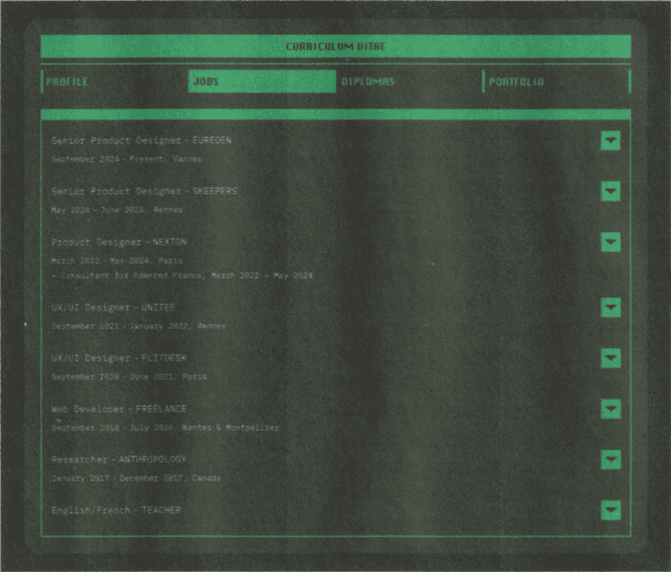 An alternative to the traditional PDF resume, this interface presents professional experience through a structured system-driven layout. Inspired by early home computers and sci-fi terminals, it provides direct access to roles and timelines.