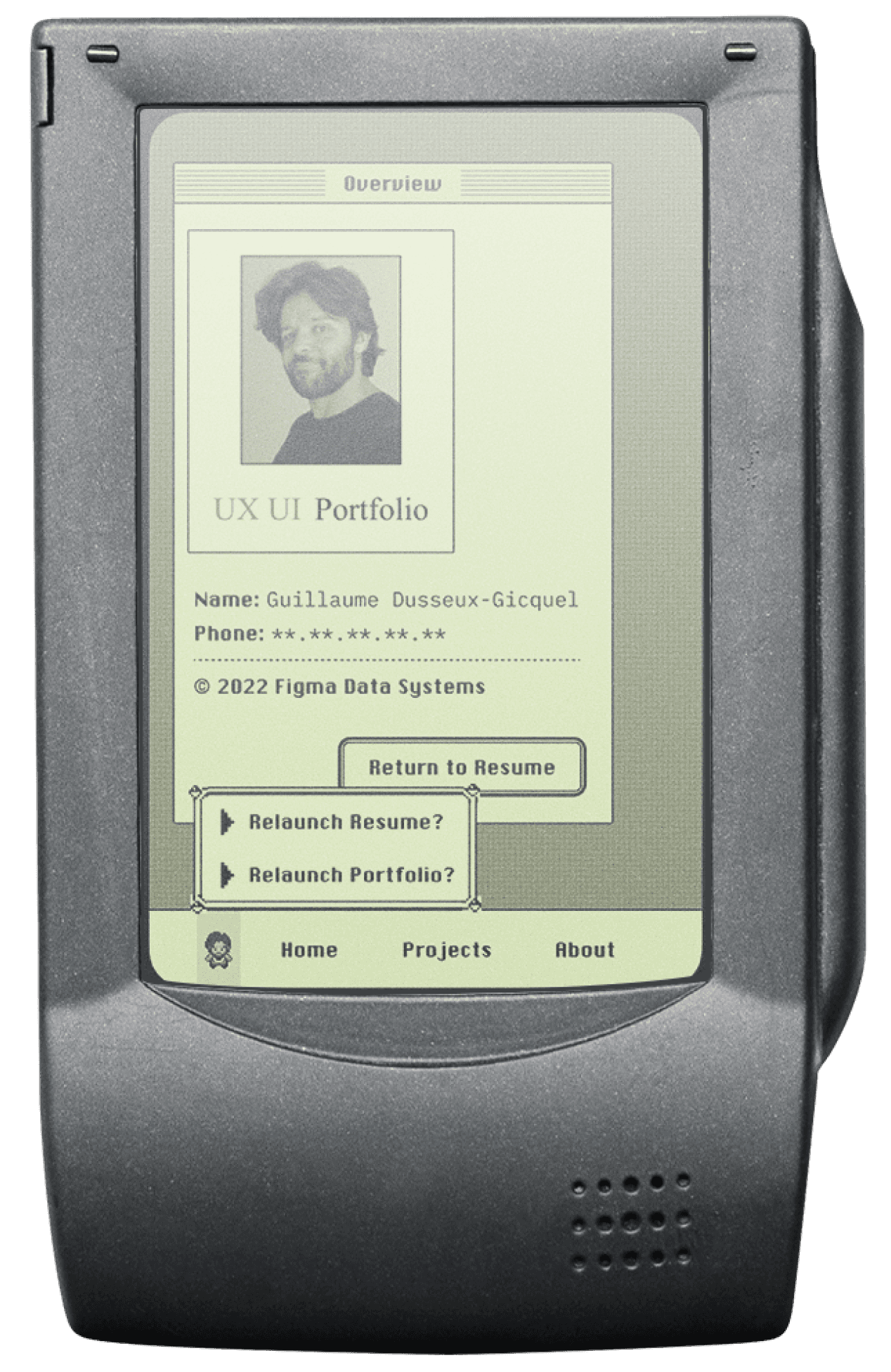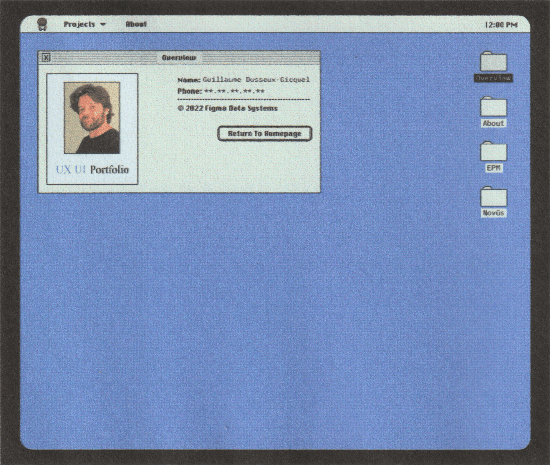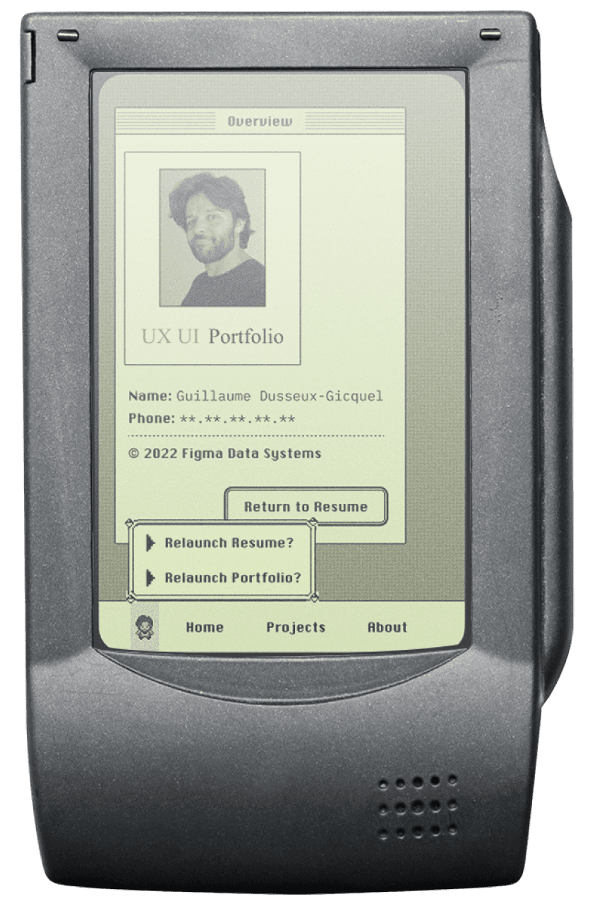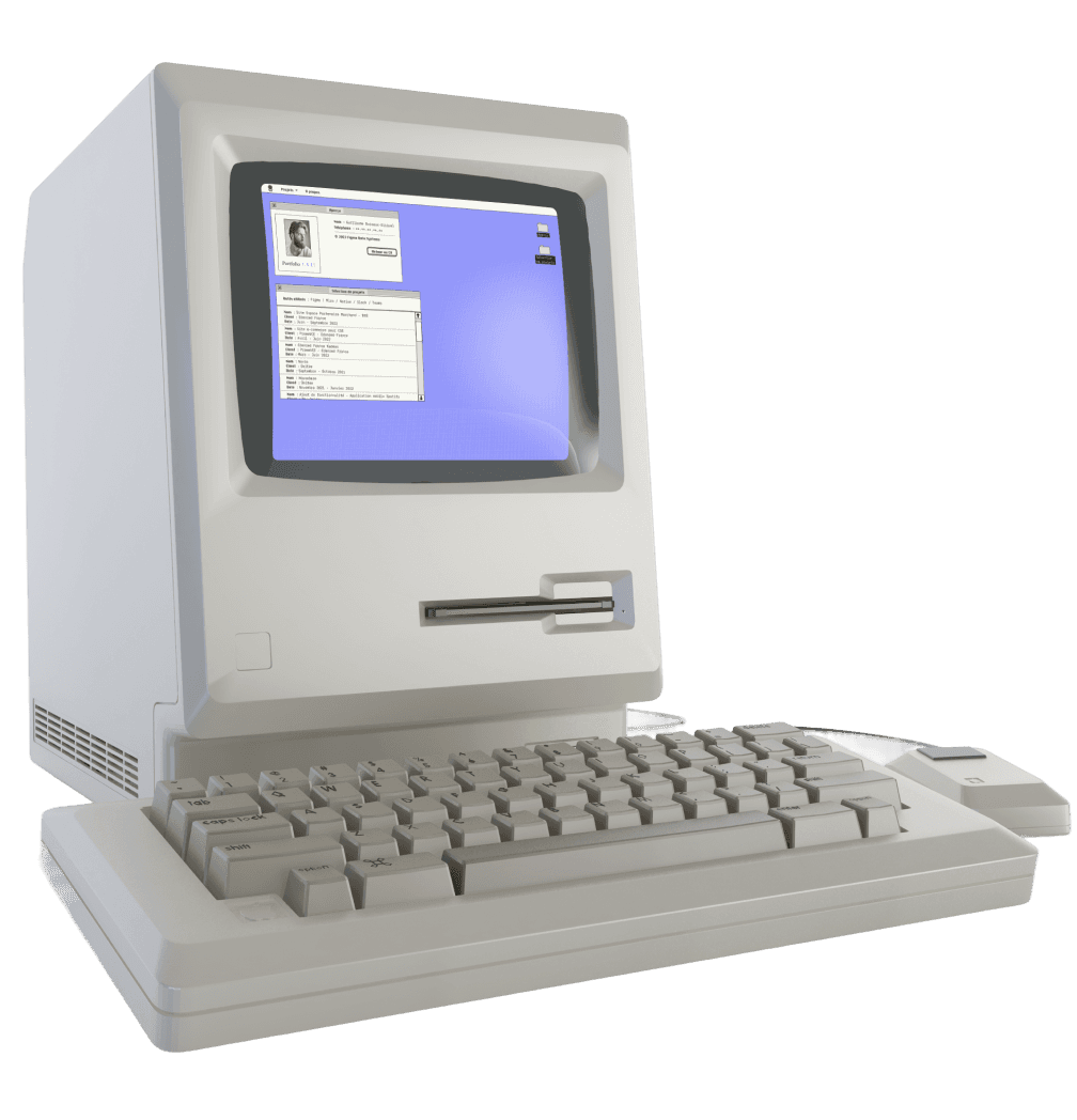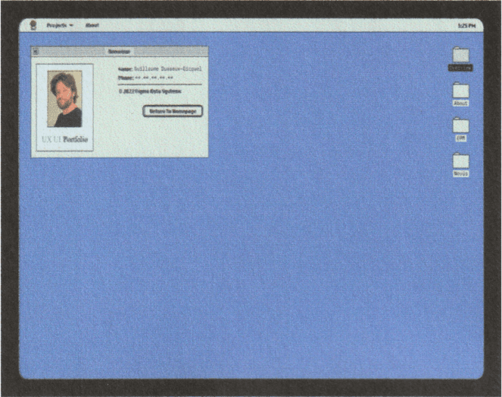 The portfolio takes the form of a classic Macintosh-inspired operating system, blending interface metaphors from the late ’80s and early ’90s with subtle influences from video games. The resume, more structured and deliberate, evokes early home computers and science-fiction interfaces, offering direct access to information through a system-like navigation.
