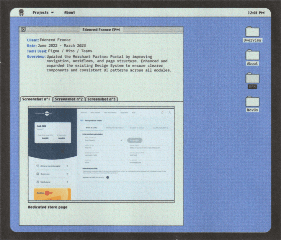 Rather than relying on static documents, the project rethinks how operating-system logic and web navigation can coexist. Developed initially in 2022 and released this year as a live website, it serves as a personal design exploration and a concise presentation of a product designer profile, showcasing professional work across SaaS products, mobile applications, and e-commerce platforms.